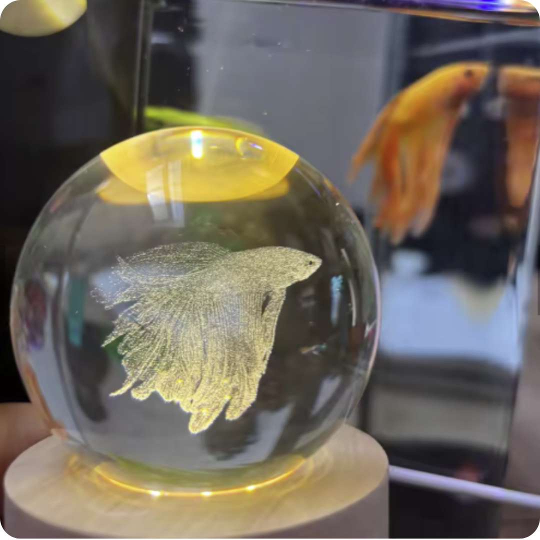 "Quería un recuerdo de nuestro pez Flopy pero dudaba de la calidad del acabado de imagen, pero me sorprendió bastante cuando llegó la esfera. ¡Es prácticamente una réplica! Estamos muy contentos de haber hecho nuestro pedido a Luces Eternas de Salu10."
